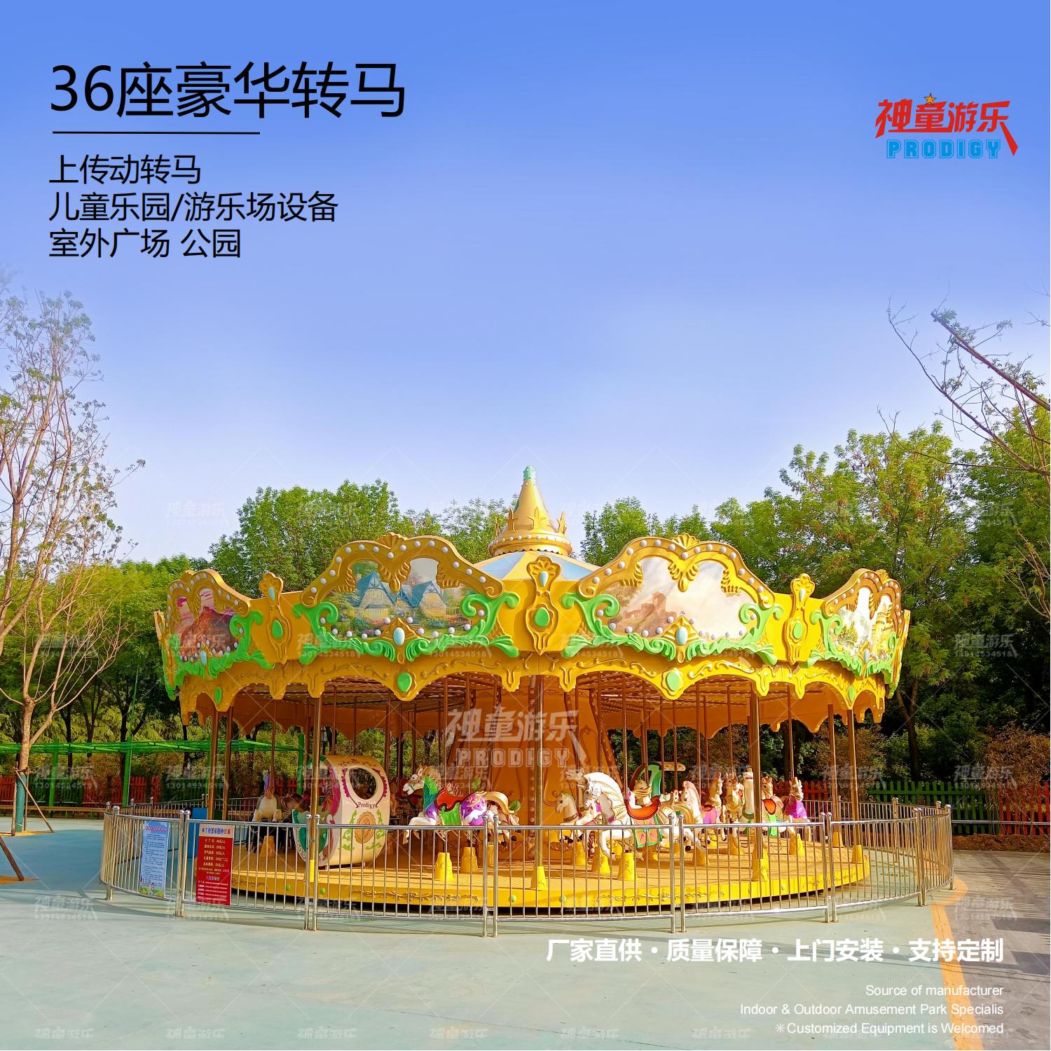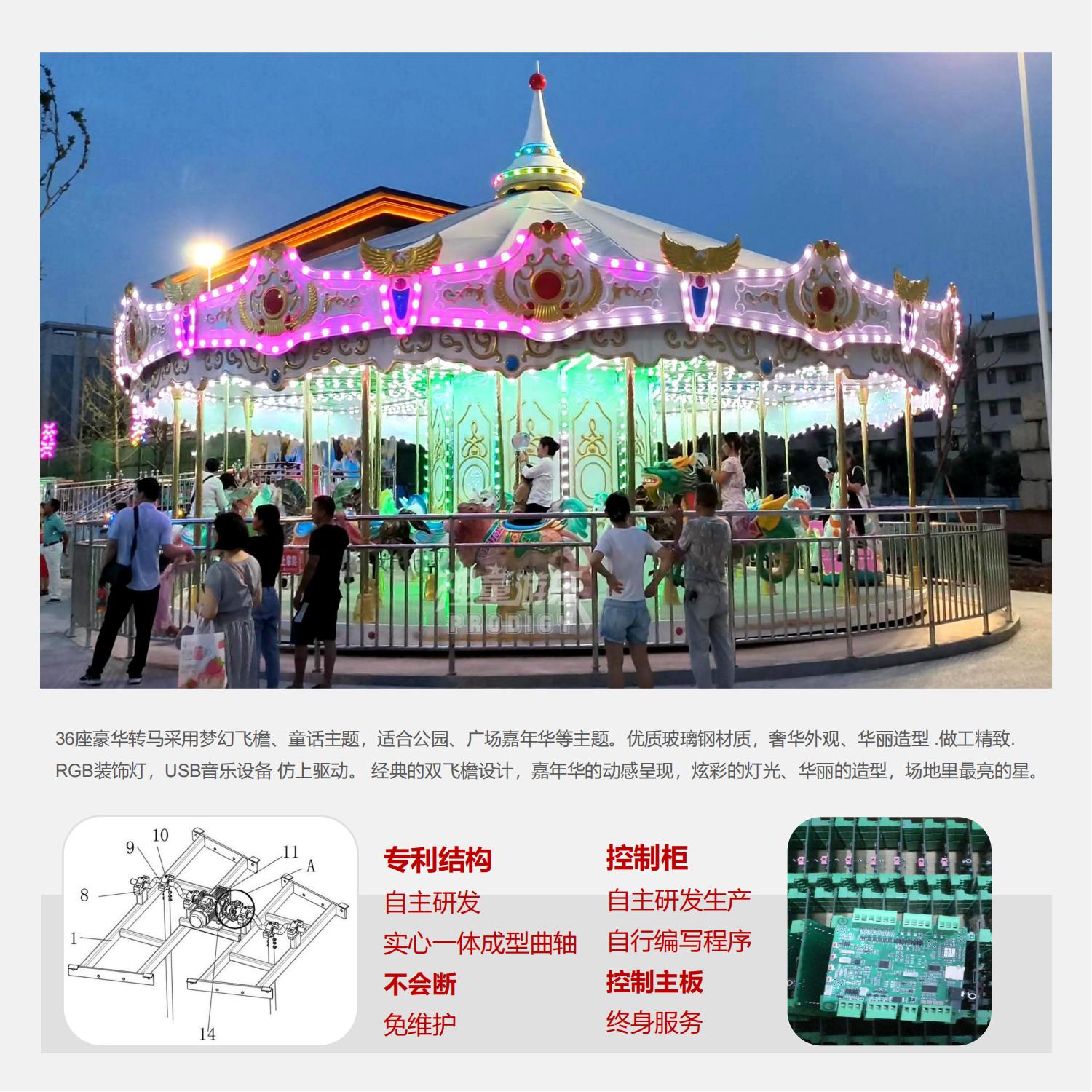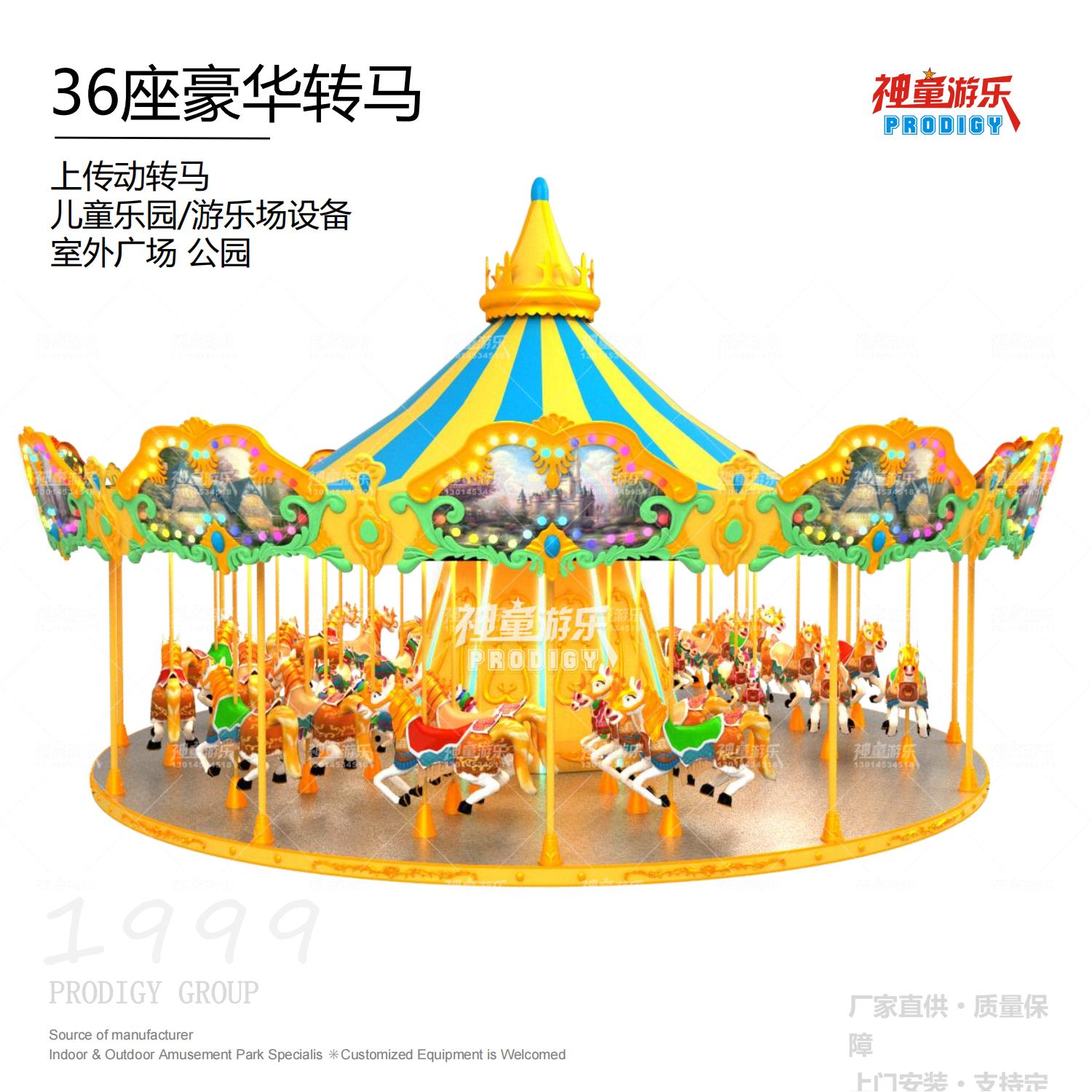 36座豪華轉(zhuǎn)馬采用夢幻飛檐、童話主題,適合公園、廣場嘉年華等主題。優(yōu)質(zhì)玻璃鋼材質(zhì),奢華外觀、華麗造型.做工精致. RGB裝飾燈,USB音樂設(shè)備 仿上驅(qū)動。 經(jīng)典的雙飛檐設(shè)計,嘉年華的動感呈現(xiàn),炫彩的燈光、華麗的造型,場地里最亮的星。