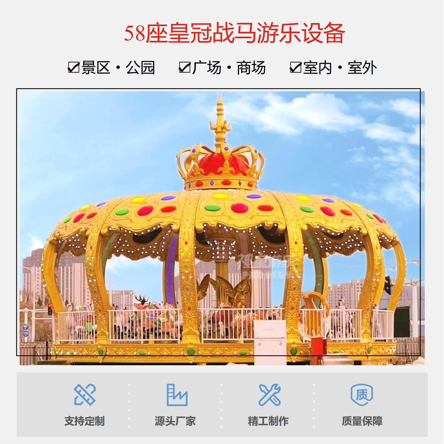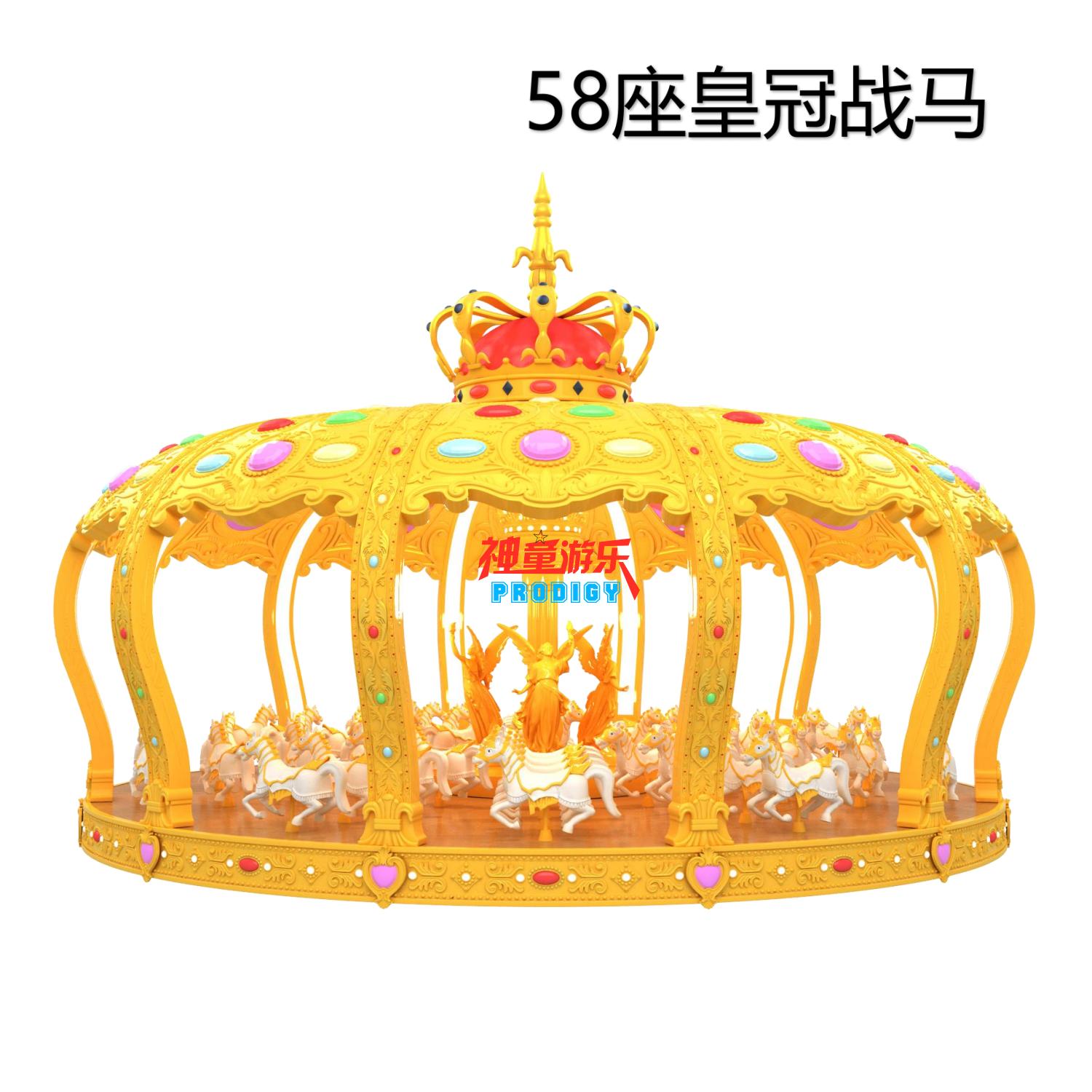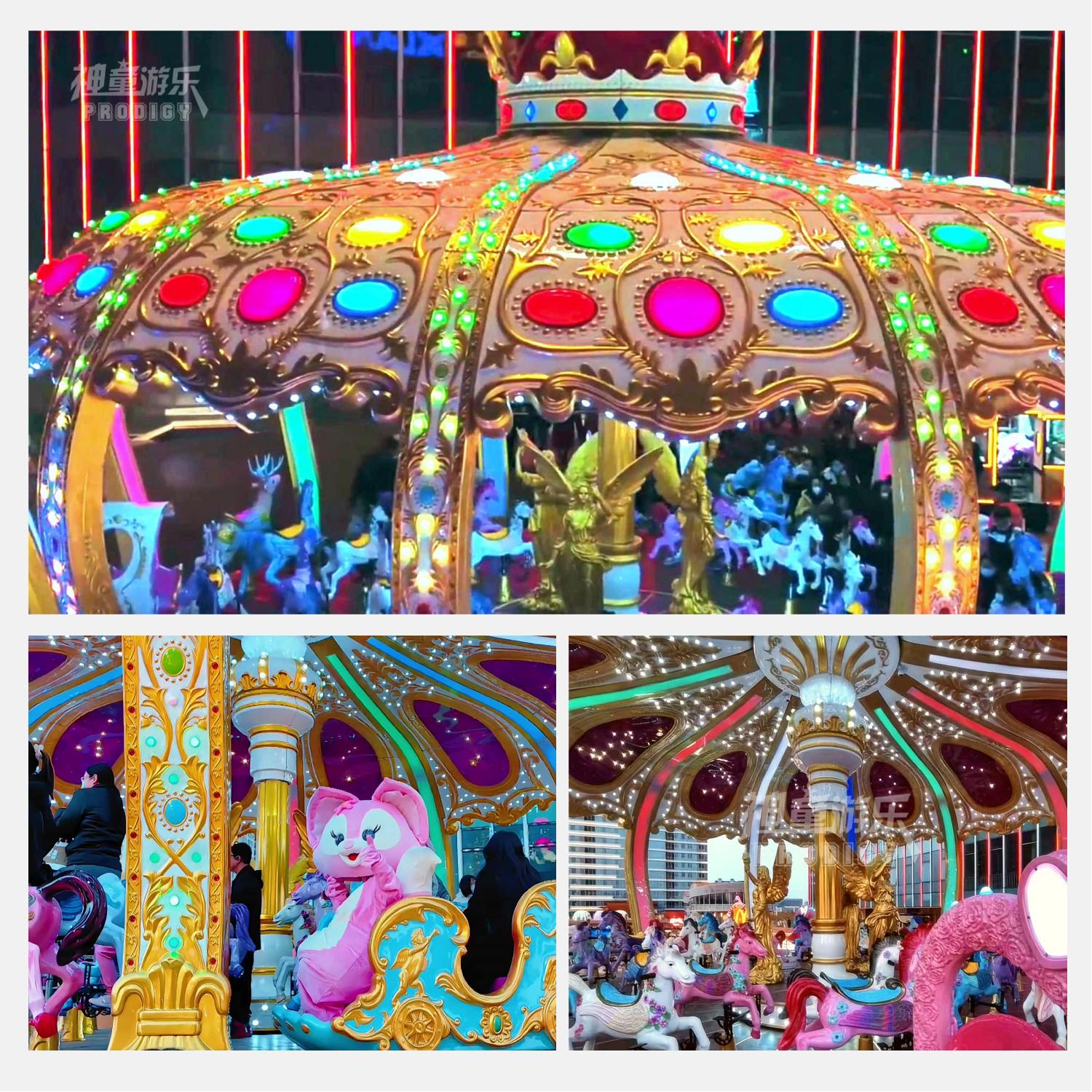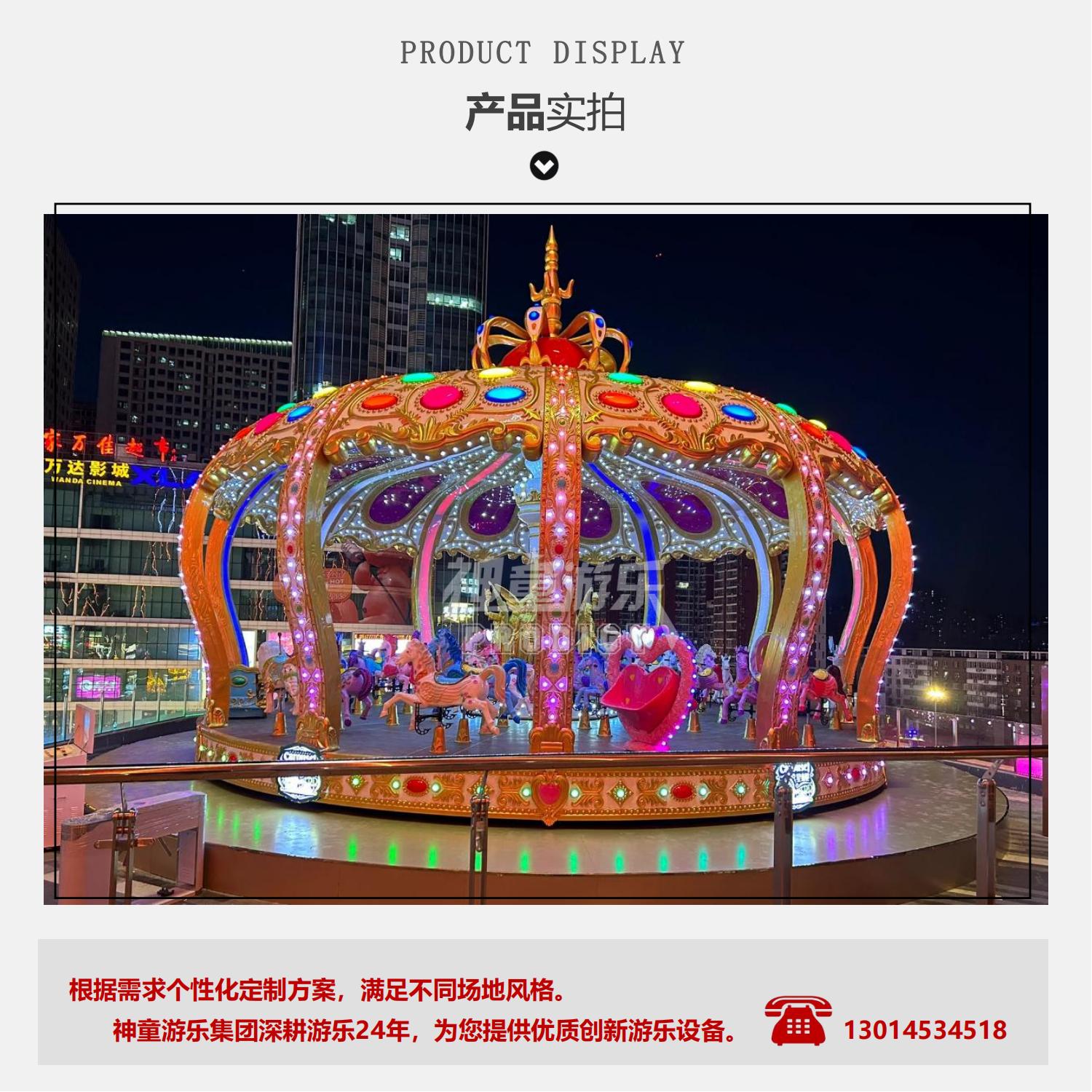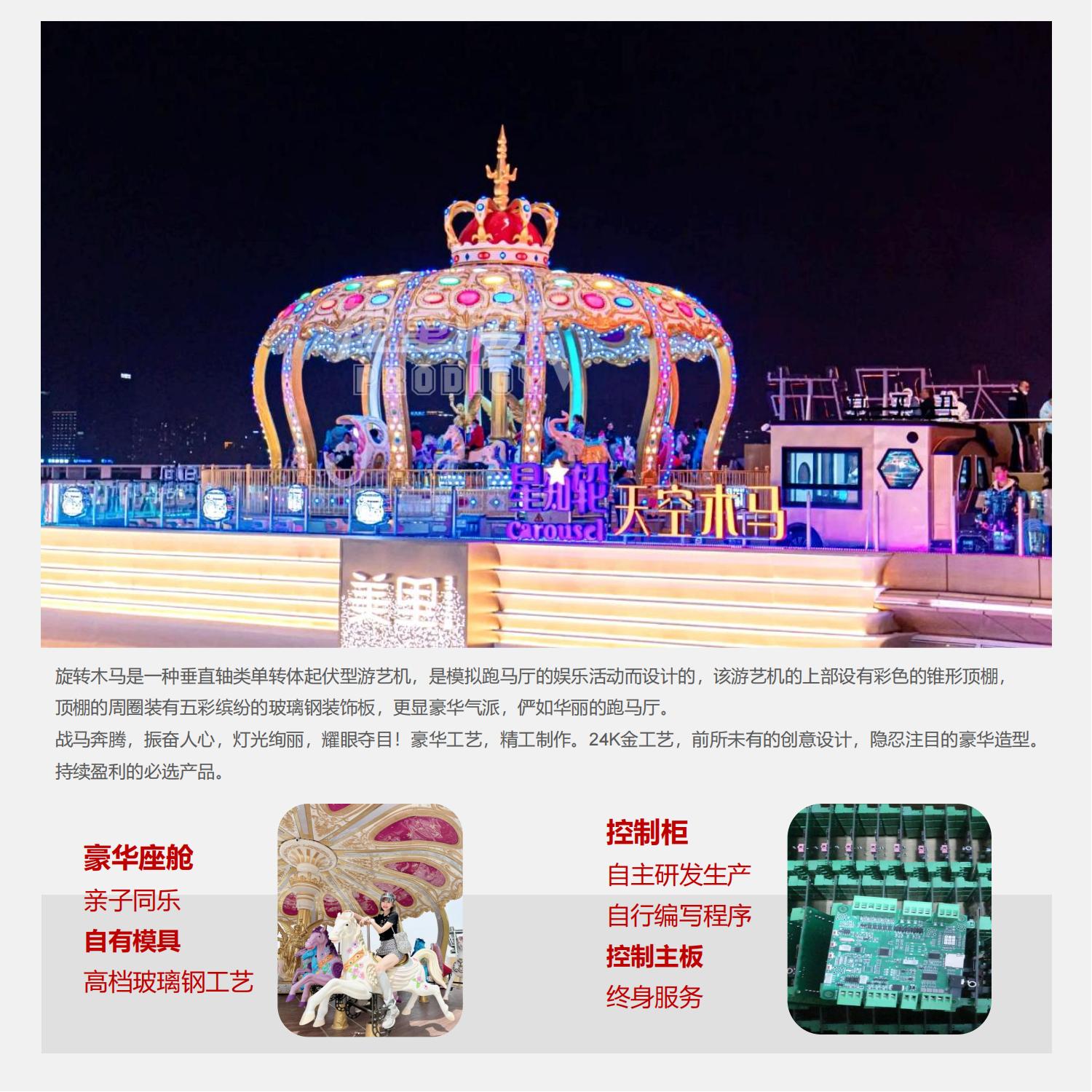 旋轉(zhuǎn)木馬是一種垂直軸類(lèi)單轉(zhuǎn)體起伏型游藝機(jī),是模擬跑馬廳的娛樂(lè)活動(dòng)而設(shè)計(jì)的,該游藝機(jī)的上部設(shè)有彩色的錐形頂棚,頂棚的周圈裝有五彩繽紛的玻璃鋼裝飾板,更顯豪華氣派,儼如華麗的跑馬廳。戰(zhàn)馬奔騰,振奮人心,燈光絢麗,耀眼奪目!豪華工藝,精工制作。24K金工藝,前所未有的創(chuàng)意設(shè)計(jì),隱忍注目的豪華造型。持續(xù)盈利的必選產(chǎn)品。