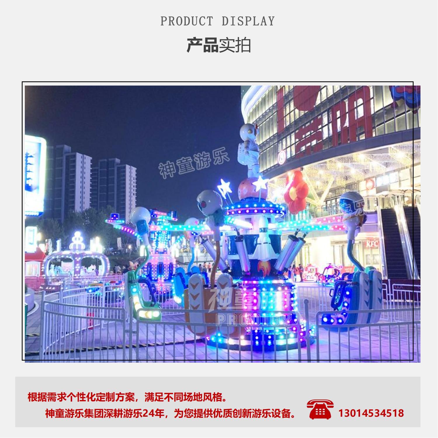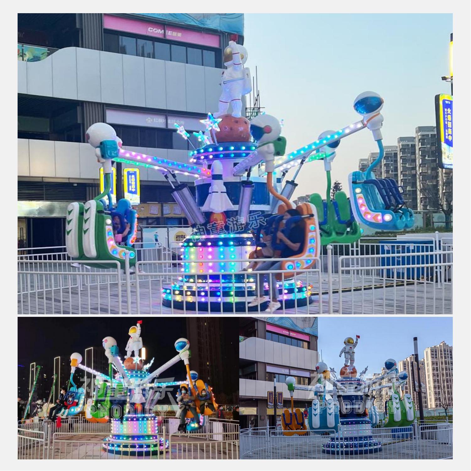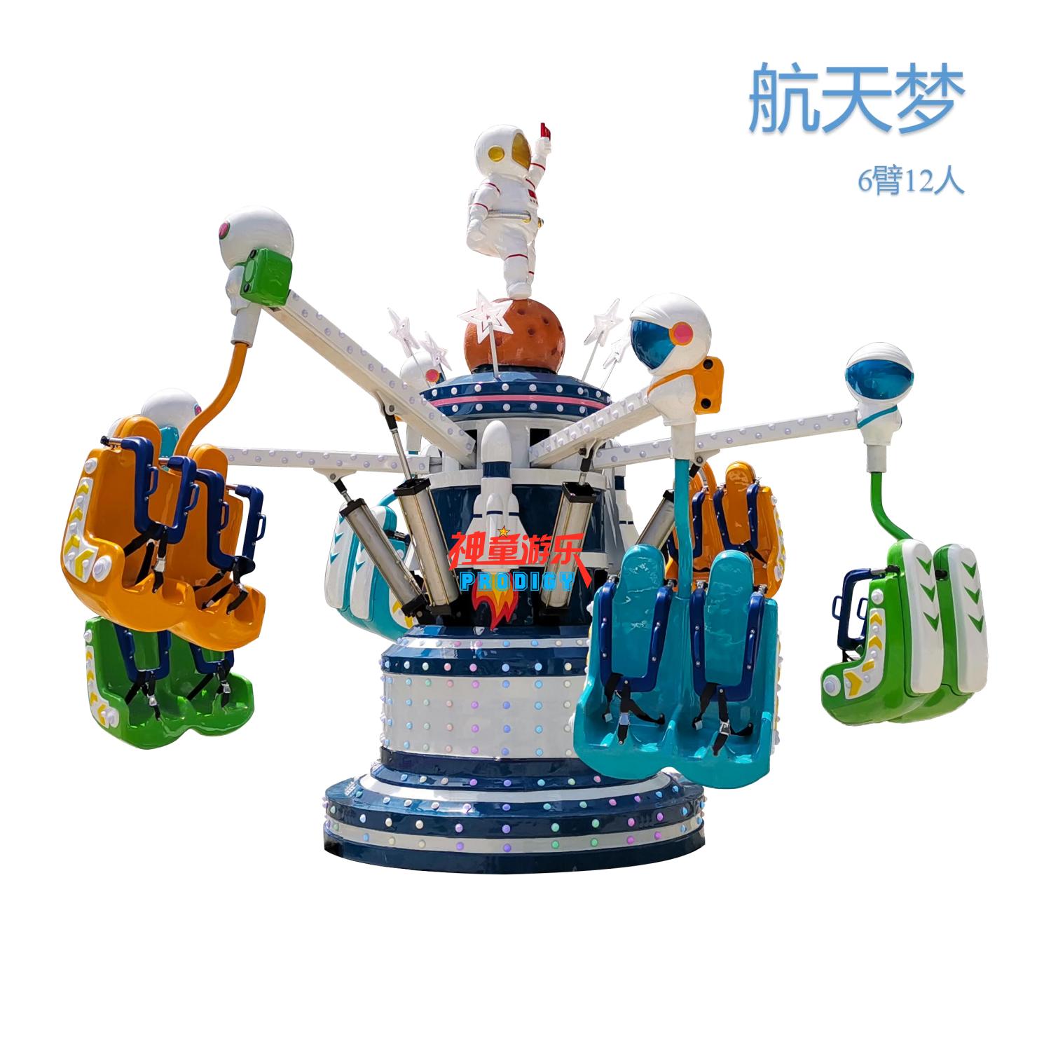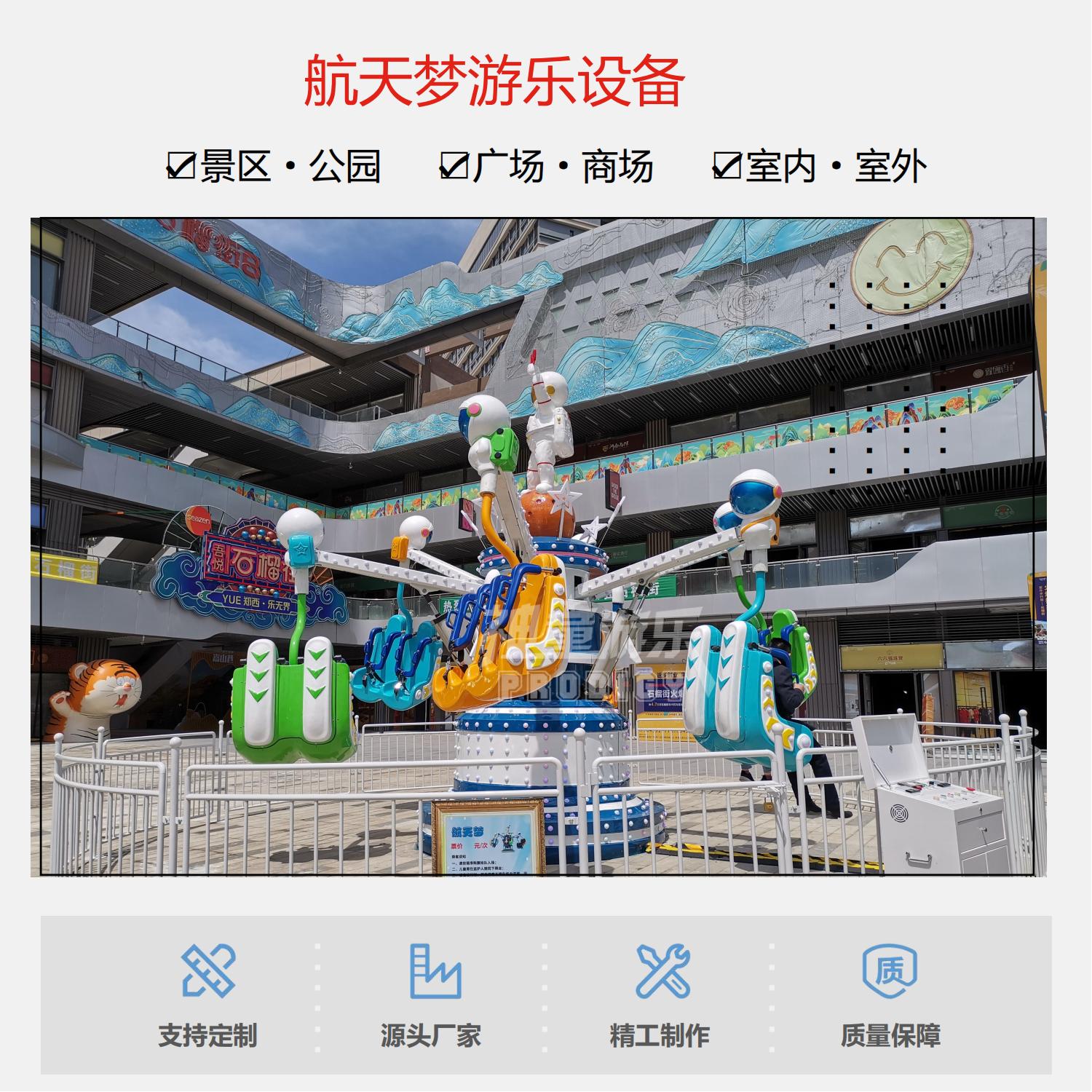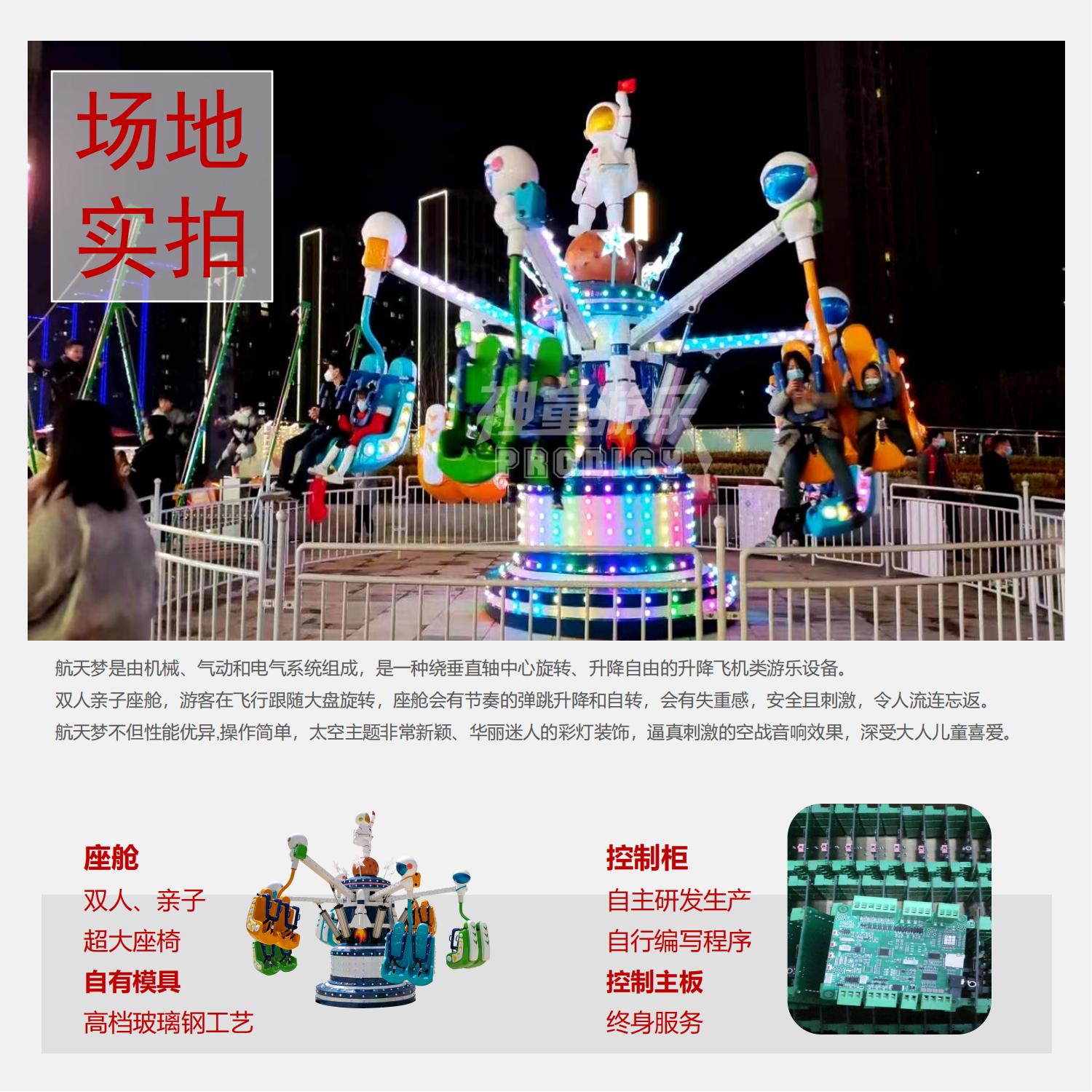 航天夢是由機(jī)械、氣動和電氣系統(tǒng)組成,是一種繞垂直軸中心旋轉(zhuǎn)、升降自由的升降飛機(jī)類游樂設(shè)備。 雙人親子座艙,游客在飛行跟隨大盤旋轉(zhuǎn),座艙會有節(jié)奏的彈跳升降和自轉(zhuǎn),會有失重感,安全且刺激,令人流連忘返。 航天夢不但性能優(yōu)異,操作簡單,太空主題非常新穎、華麗迷人的彩燈裝飾,逼真刺激的空戰(zhàn)音響效果,深受大人兒童喜愛。