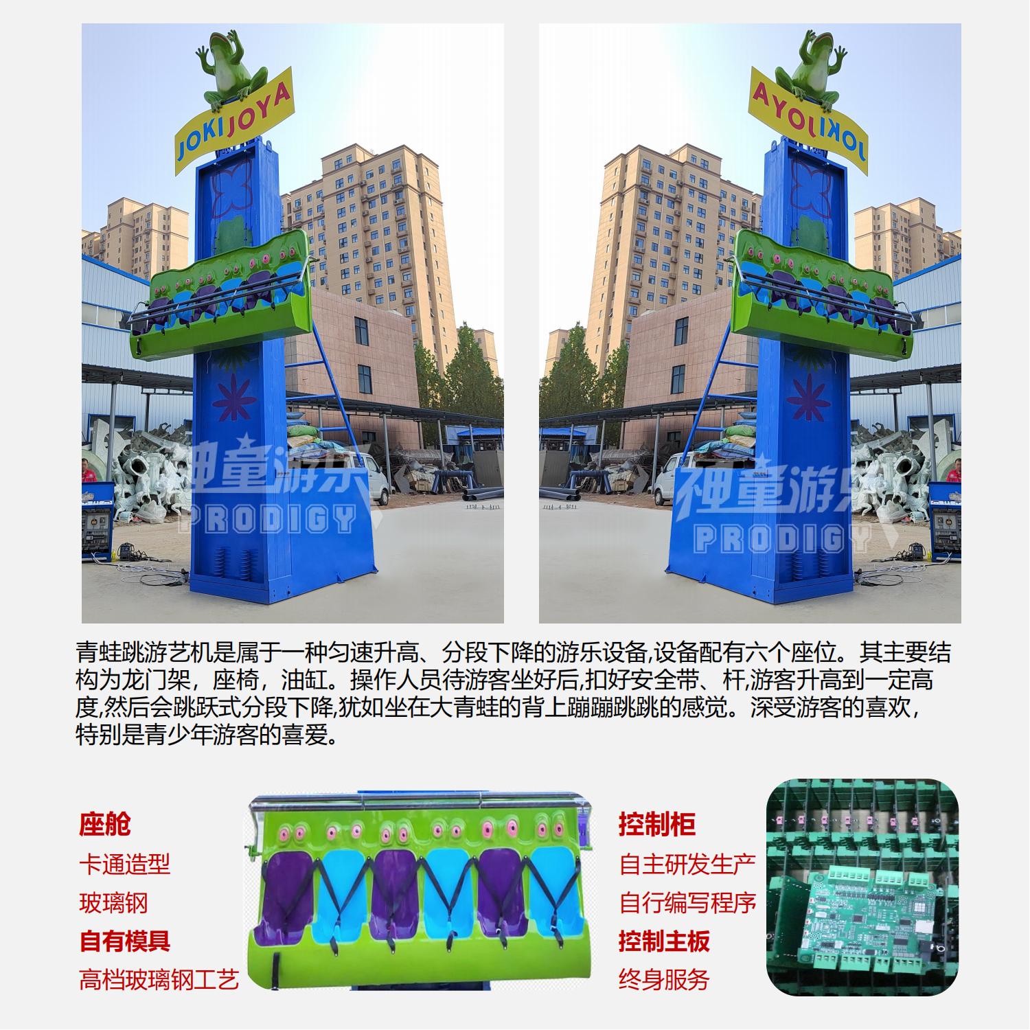 青蛙跳游藝機(jī)是屬于一種勻速升高、分段下降的游樂設(shè)備,設(shè)備配有六個(gè)座位。其主要結(jié)構(gòu)為龍門架,座椅,油缸。操作人員待游客坐好后,扣好安全帶、桿,游客升高到一定高度,然后會跳躍式分段下降,猶如坐在大青蛙的背上蹦蹦跳跳的感覺。深受游客的喜歡,特別是青少年游客的喜愛。
