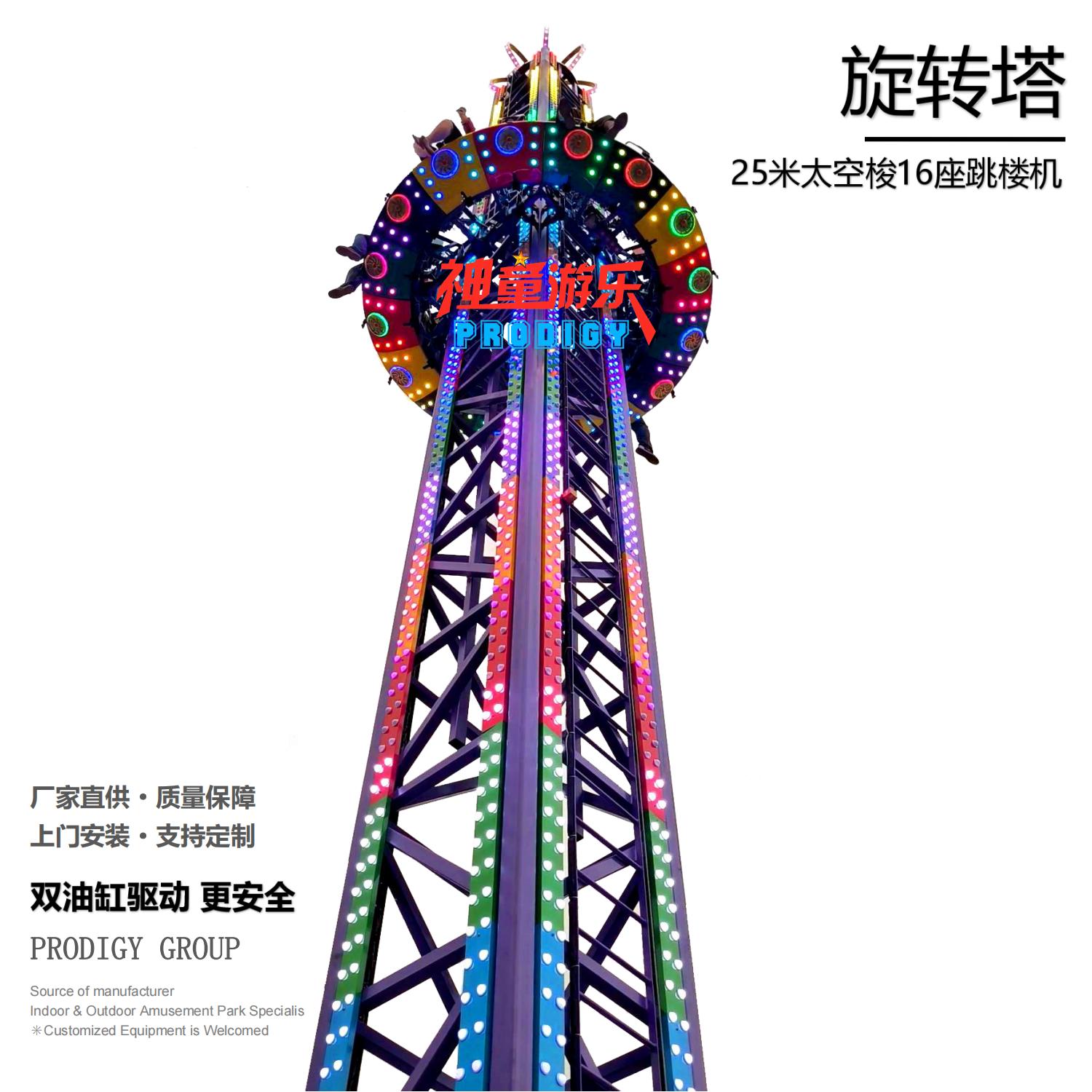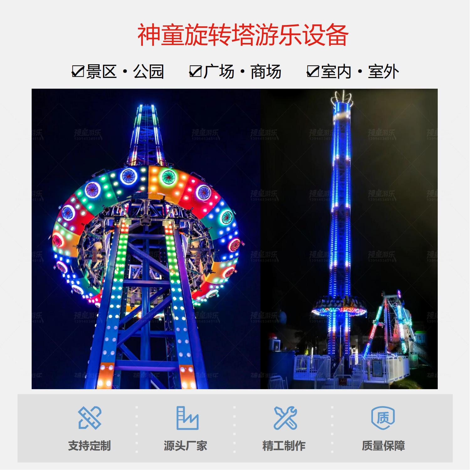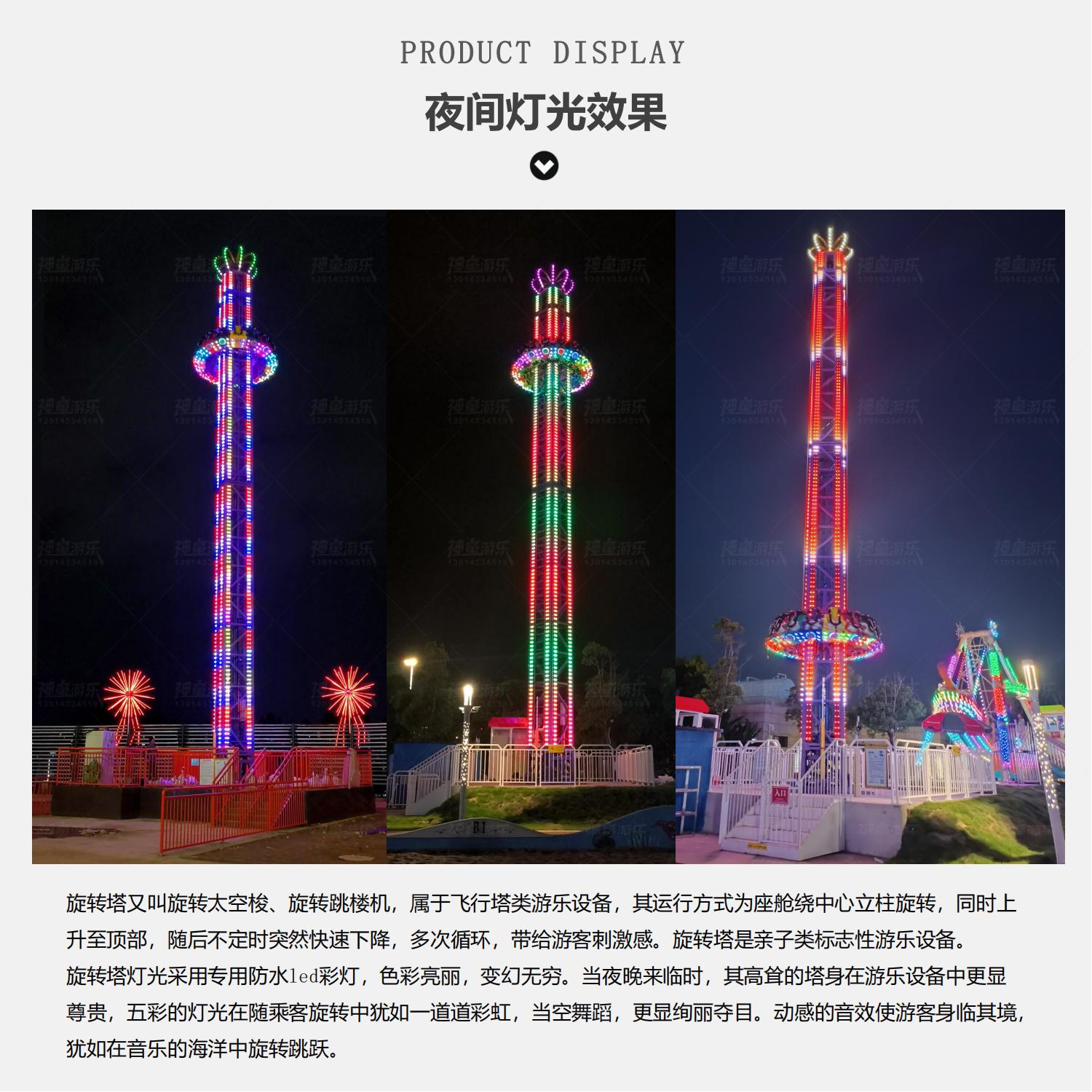 旋轉塔又叫旋轉太空梭、旋轉跳樓機,屬于飛行塔類游樂設備,其運行方式為座艙繞中心立柱旋轉,同時上升至頂部,隨后不定時突然快速下降,多次循環(huán),帶給游客刺激感。旋轉塔是親子類標志性游樂設備。當夜晚來臨時,其高聳的塔身在游樂設備中更顯尊貴,五彩的燈光在隨乘客旋轉中猶如一道道彩虹,當空舞蹈,更顯絢麗奪目。動感的音效使游客身臨其境猶如在音樂的海洋中旋轉跳躍。