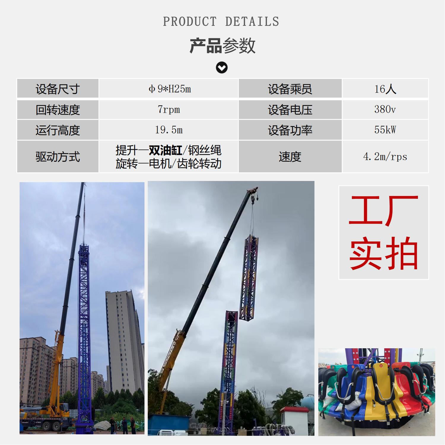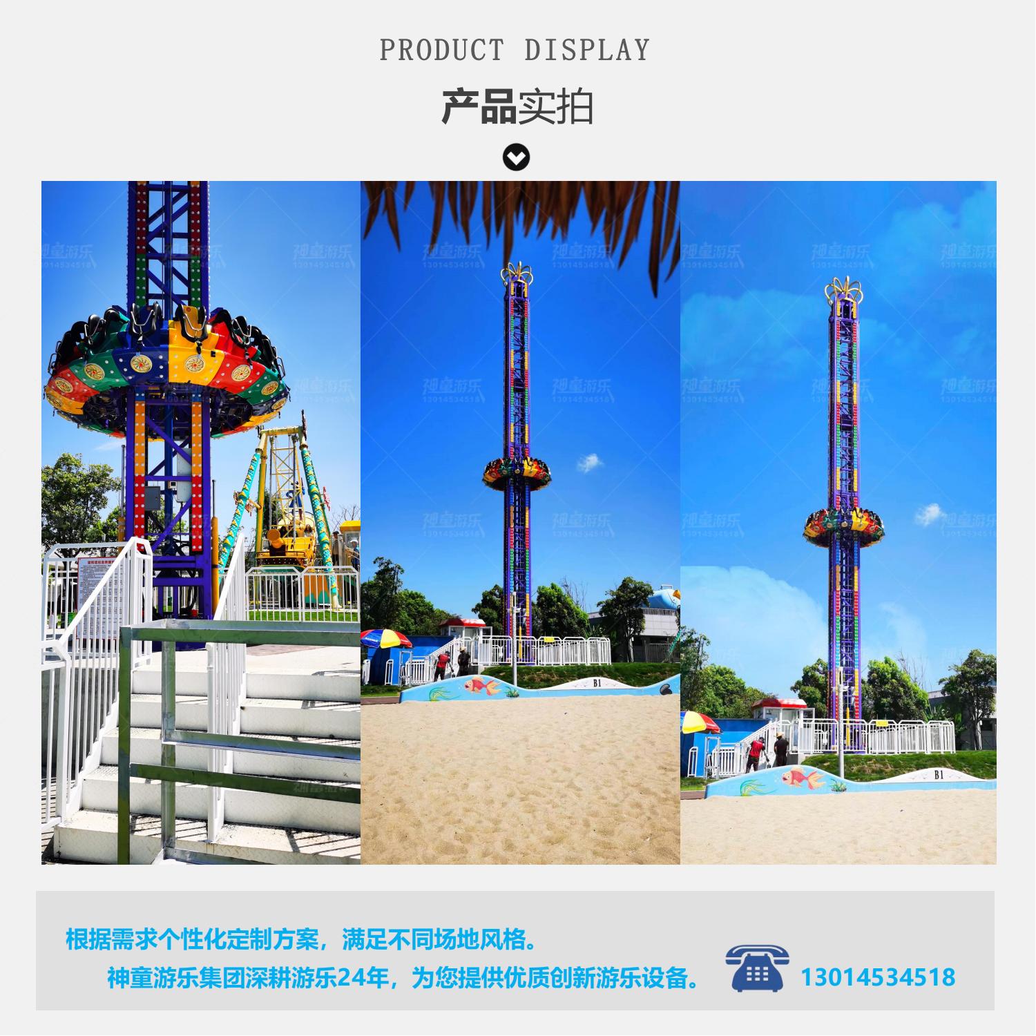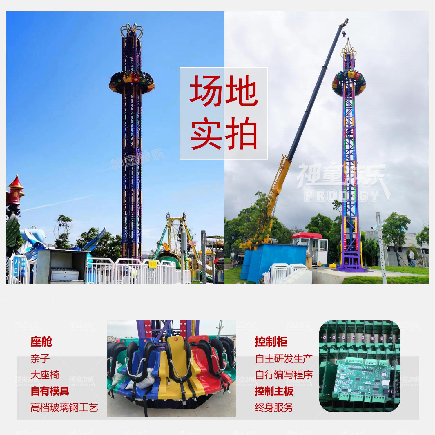 旋轉塔又叫旋轉太空梭、旋轉跳樓機,屬于飛行塔類游樂設備,其運行方式為座艙繞中心立柱旋轉,同時上升至頂部,隨后不定時突然快速下降,多次循環(huán),帶給游客刺激感。旋轉塔是親子類標志性游樂設備。當夜晚來臨時,其高聳的塔身在游樂設備中更顯尊貴,五彩的燈光在隨乘客旋轉中猶如一道道彩虹,當空舞蹈,更顯絢麗奪目。動感的音效使游客身臨其境猶如在音樂的海洋中旋轉跳躍。